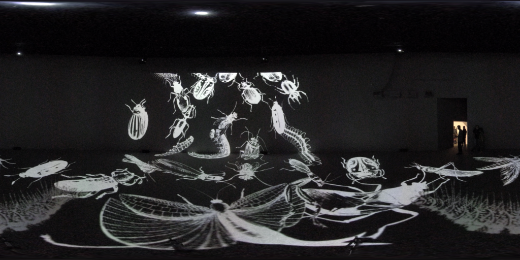 In Colloquium, the repulsion to contact between interactors and virtual insects – made explicit by the instantaneous erasure of insects and their successive multiplication through the walls – is reinforced by the environmental sound dimension. Formed by sound tracks specific to insects, the sound environment can become intolerable due to its disorderly accumulation.