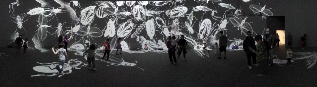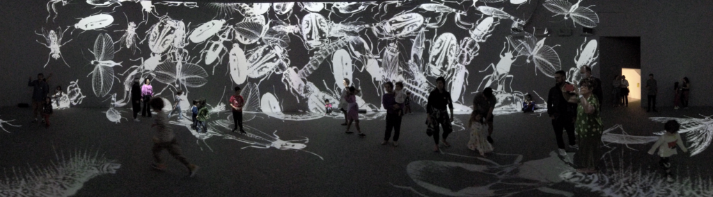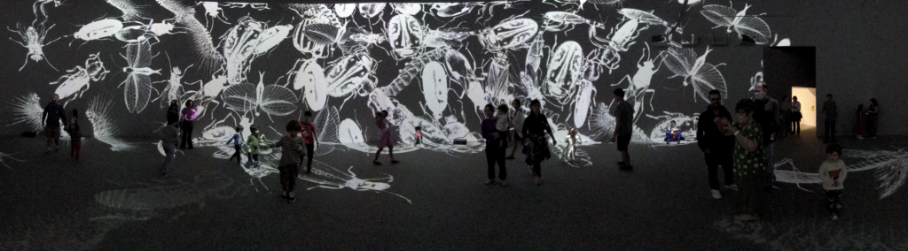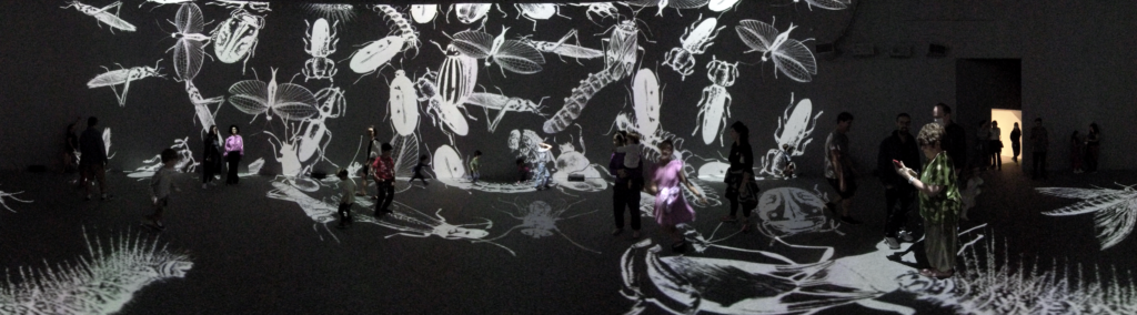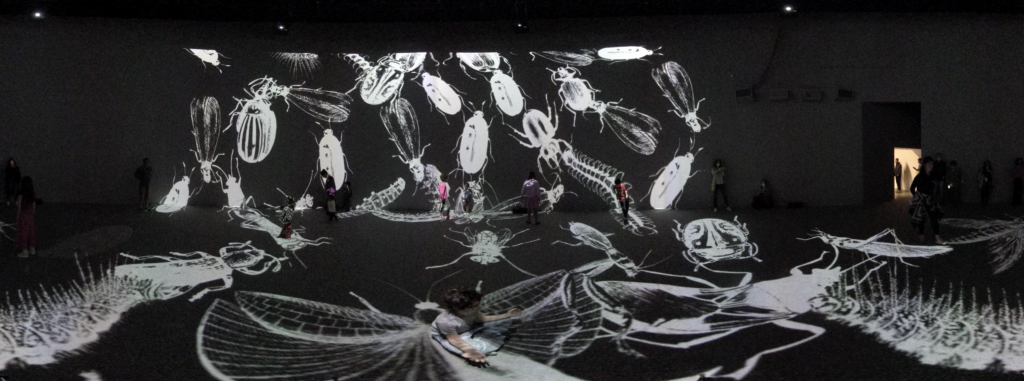 In Colloquium, large virtual insects respond to human presence, or intrusion, metaphorically acting as an immunological system, dispersing or regrouping themselves depending on visitors’ behaviors.
