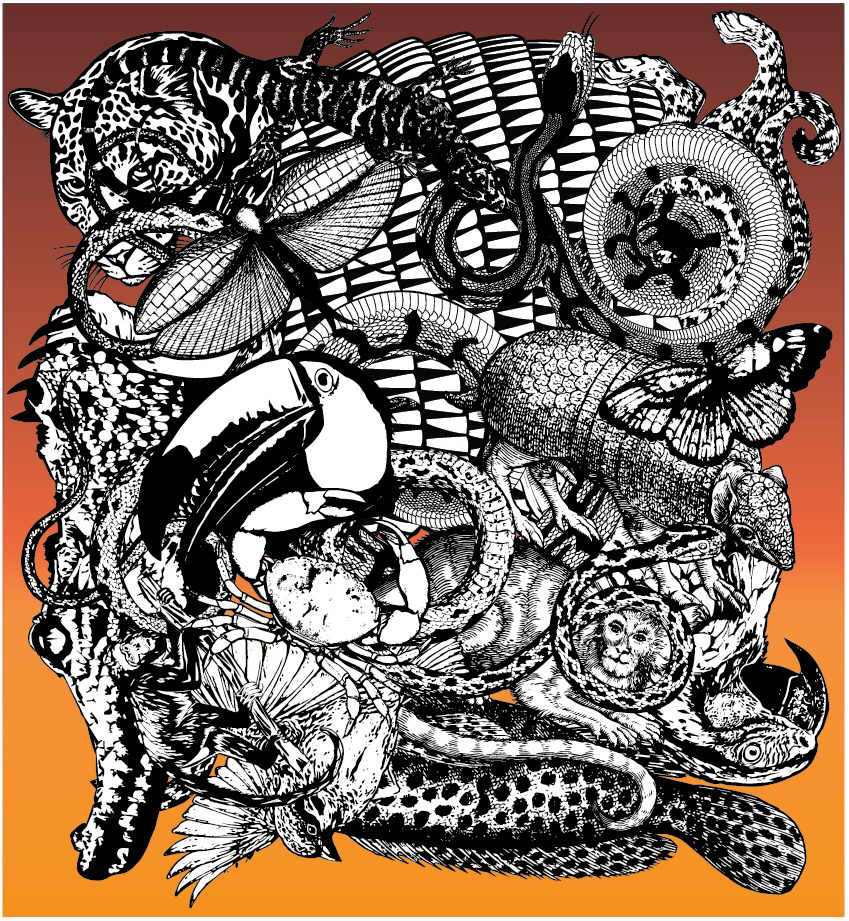 e-Arena is the 2025 creation in a series of artworks reimagining biblical plagues as contemporary metaphors for global crises. These symbolic “plagues,” here represented both by Brazilian fauna reptiles coexisting with malevolent insects, address issues spanning social, environmental, cultural, and civilizational concerns, reflecting on a future fraught with challenges.