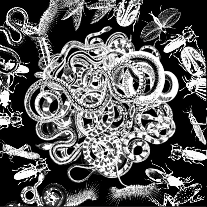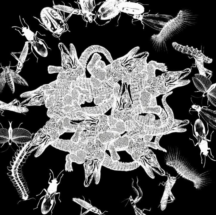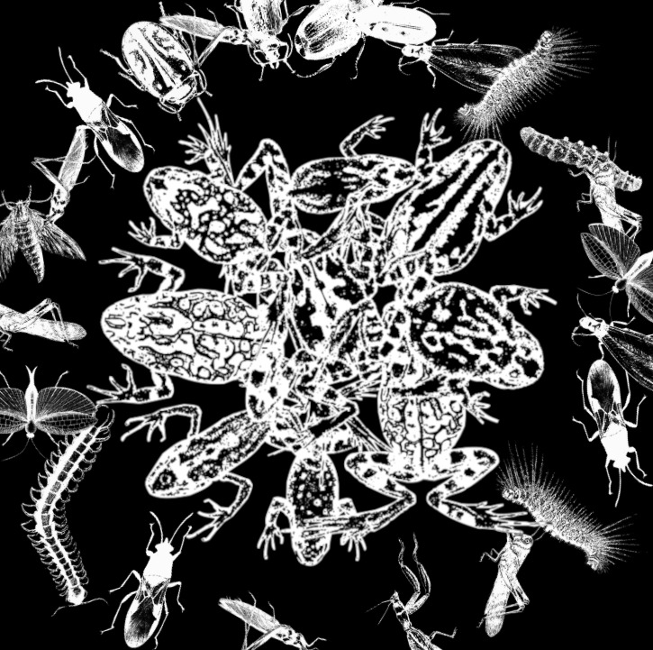 Originally conceived as static graphic patterns designed for application on various surfaces or installation walls and floors, this imagery has evolved in the current artwork (as it did in the previous COLLOQUIUM, 2022) into a digital interactive sound animation—a metaphorical ecosystem where large virtual insects populate the walls, while three predator species—frogs, crocodiles, and snakes—occupy the floor.